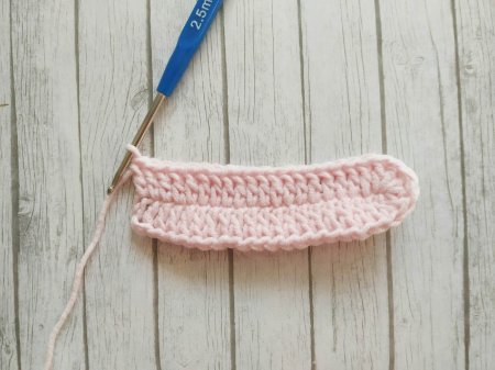 Дальше нужно связать завязки, поэтому вязание нужно развернуть. Выполнить 6 сбн. Развернуться и провязать 6 ссн. Затем связать ряд, в котором начать и закончить убавкой. Дальше просто вязать по 1 ссн в петлю, то есть всего по 4 ссн в каждом ряду. Вязать до необходимой длины.