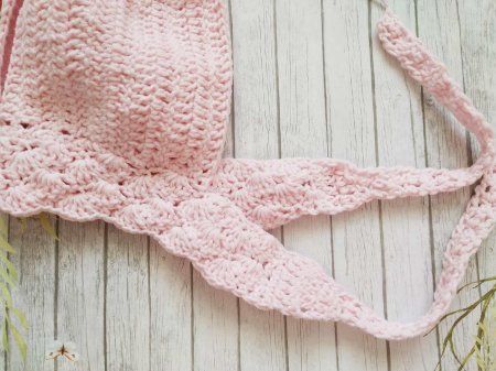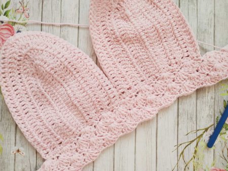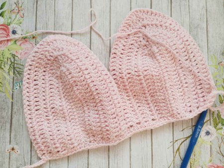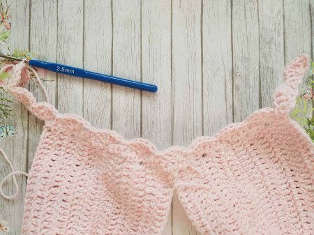 Нитку присоединить к чашечкам и сделать обвязку точно так же, как и вязали снизу топа. Попутно сделать верхние завязки, выполнив необходимое количество петель, в которые нужно связать по 1 сс.