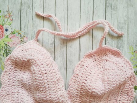 Сначала нужно связать 2 чашечки, а потом соединить их. Далее сделать обвязку и ремешки. Чтобы связать чашечку, нужно набрать 19 воздушных петель. Дальше еще 3 петли и с 4 петли от крючка провязать до самого конца по 1 ссн в каждую петлю ряда. В последнюю нужно связать 6 столбиков подряд. Затем обвязать цепочку по другой стороне.