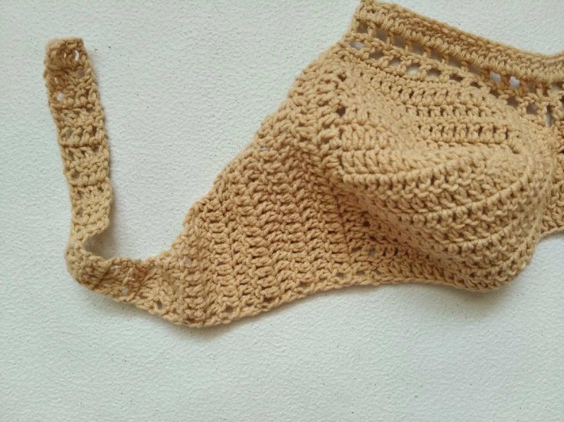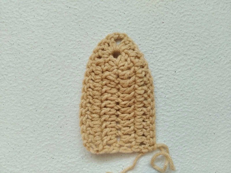 Теперь будем вязать боковую часть с завязками. Присоединяем пряжу и вяжем 1 ряд Ст СН по боку чашечки. А в каждом следующем ряду будем делать убавку сверху, пока не останется 4-6 столбиков. Их мы вяжем до нужной длины завязки.
