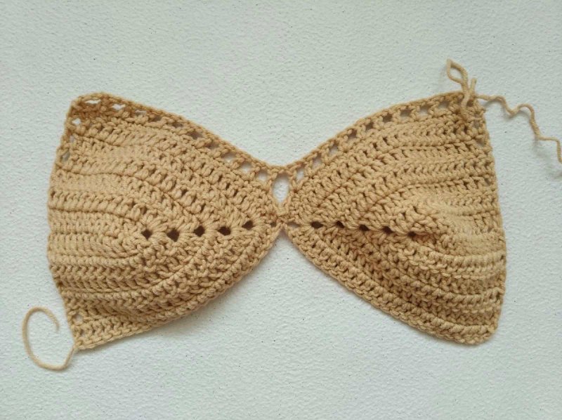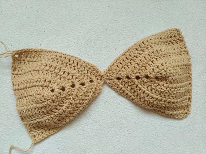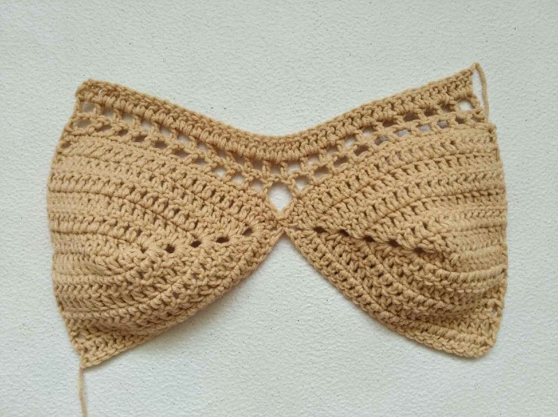 И так вяжем до середины. Не довязываем до середины (там, где чашечки соединяются) 2 петли. Их пропускаем. Среднюю петлю соединения тоже пропускаем и пропускаем следующие 2 петли. А дальше продолжаем вязание.