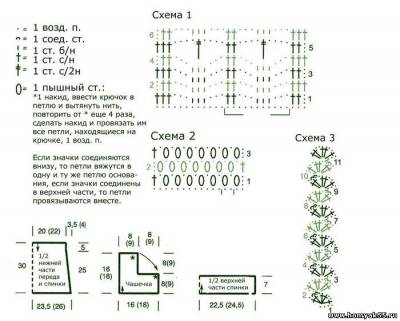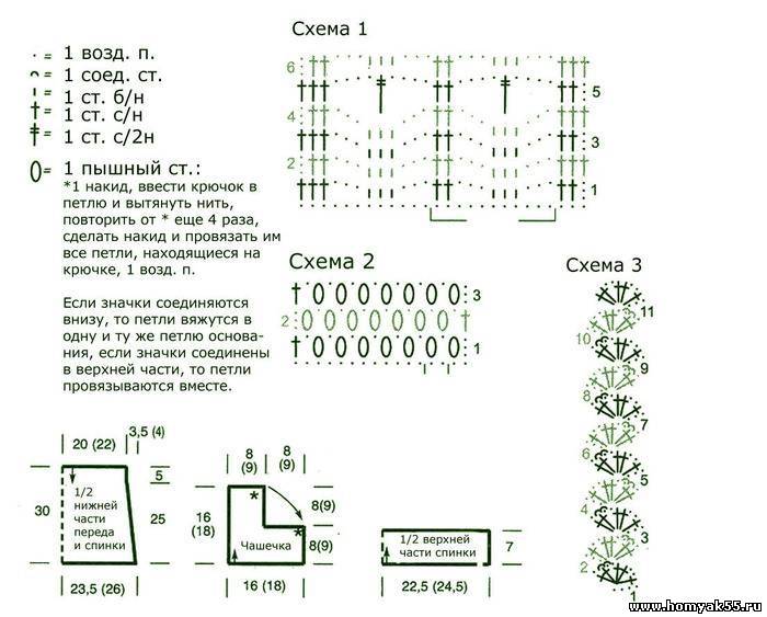 Для чашечки свяжите цепочку из 32 (36) ВП + 3 ВП подъема и вяжите узором из «шишечек». Через 8 (9) см от наборного края оставьте для центрального шва с правой стороны 8 (9) см. Через 16 (18) см от наборного края работу закончить. Свяжите 2 детали. Выполните центральный шов каждой чашечки, совместив значки на выкройке, и сшейте их посередине переда на 2 см. Выполните один боковой шов верхней части топа. Выполните боковые швы нижних частей и пришейте к верхней части. Верхний край обвяжите арками.