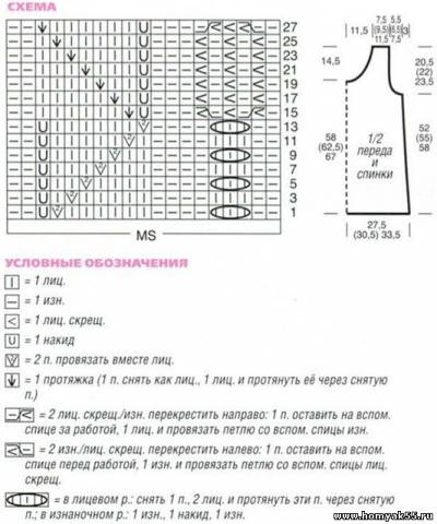 Сначала вяжутся целиком: крестообразным набором набрать 304 (342) 380 петель и вязать ажурным узором.$CUT$ Через 34,5 (37,5) 40,5 см = 100 (110) 120 рядов от наборного края провязать внутри полос из изн. петель по 2 петли вместе изн. = 272 (306) 340 петель. Через 52 (55) 58 см = 150 (160) 170 рядов от наборного края разделить работу следующим образом: 6 петель отложить: на следующих 137 (154) 171 петлях связать спинку.