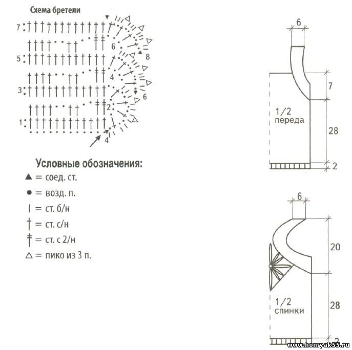 Вяжите крючком полоску по схеме до необходимой длины. Длина полоски должна включать длину самой бретели + длину проймы.