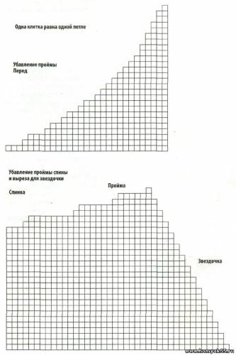Наберите на спицы 100 петель, провяжите 2 см резинкой 2 x 2. Далее вяжите лиц. гладью 17 см. Затем вывяжите вырез для «звездочки» по схеме. Через 8 см от начала выреза начинайте вывязывать проймы по той же схеме.