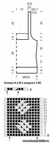 Набрать 104 (112) петли на спицы № 3,5. Выполнить 1 изн. ряд изн. петлями. Затем вязать для нижней планки 6 см = 20 рядов ажурным узором А. В последнем ряду равномерно прибавить 0 (2) петель, вывязав их скрещенными из протяжек = 104 (114) петли. Продолжить работу ажурным узором В. Для боковых скруглений убавить с обеих сторон в 17-м и 33-м рядах от нижней планки по 1 петле = 100 (110) петель. Через 11 см = 36 рядов от конца нижней планки сделать с обеих сторон по метке для линии талии. Для боковых скосов прибавить с обеих сторон в 11-м и 33-м рядах от меток по 1 петле = 104 (114) петли. Через 16 см = 52 ряда от меток закрыть с обеих сторон для пройм по 5 петель, затем в каждом 2-м ряду 2 (3) раза по 2 петли и 7 раз по 1 петле = 72 (78) петли. Через 7 см = 24 ряда от начала пройм закрыть для прямого края выреза горловины все петли.