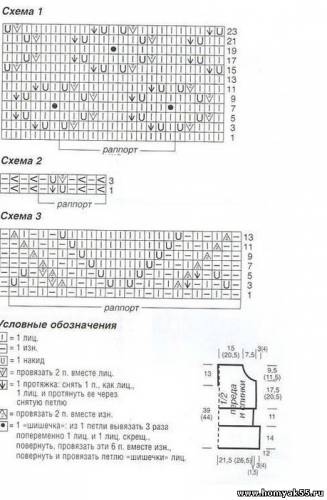Узор из шишечек, спицы № 4: число петель кратно 12 + 11 + 2 кром. Вязать по схеме 1, на которой приведены только лицевые ряды, в изнаночных рядах все петли и накиды вязать изн. Начинать с 1 кром. и петель перед раппортом, повторять раппорт, заканчивать петлями после раппорта и 1 кром. Повторять с 1-го по 24-й ряды.$CUT$