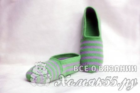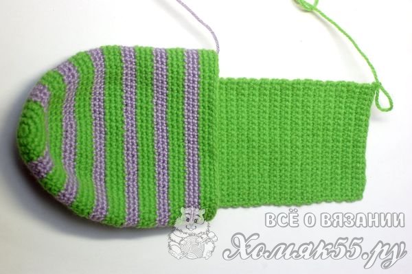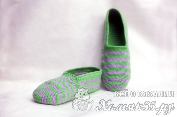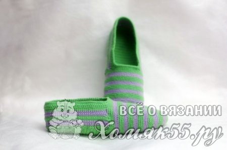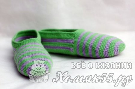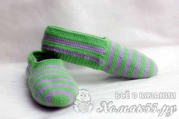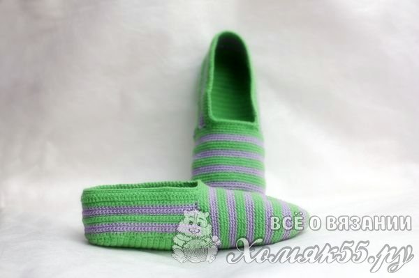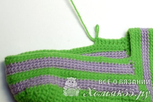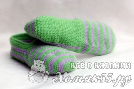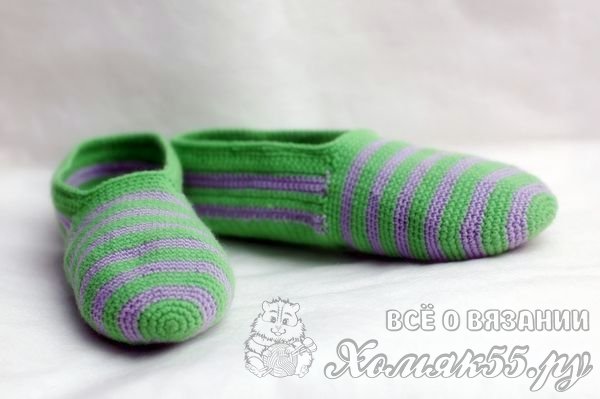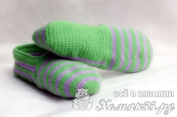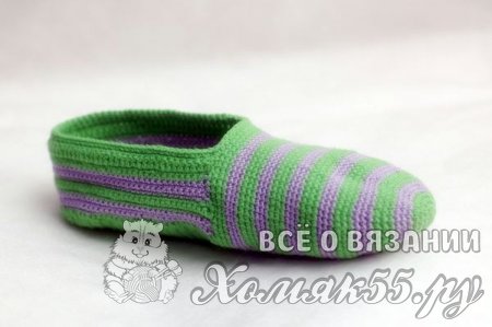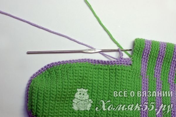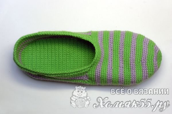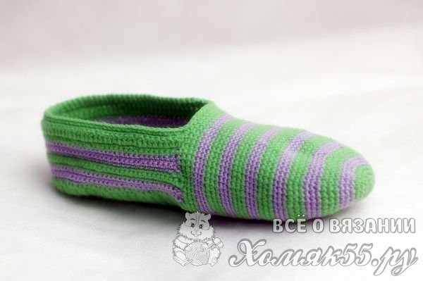 Дальше продолжим по боковой поверхности полуряд до места встречи носка и подошвы, там берём сиреневую нитку и обвязываем всю подошву столбиками без накида. Вяжем так же по три ряда каждым цветом, в каждом ряду привязываясь к носковой части.