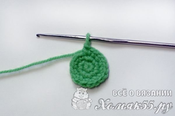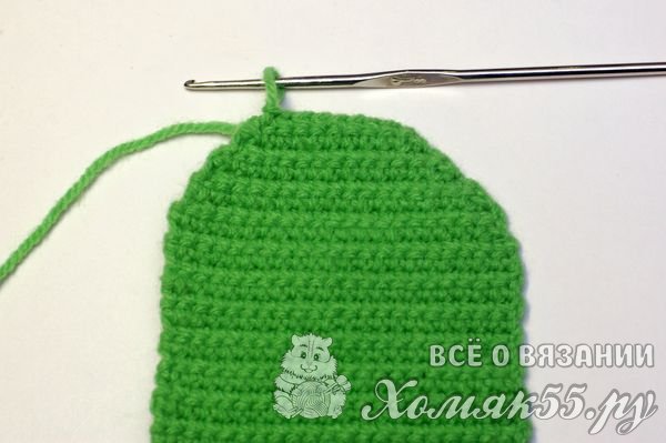 Начинаем вязать подошву: 30 рядов зелёным цветом 21 столбик. Но мы вязать будем не круговым рядом, а поворачивая вязание и в конце каждого ряда всегда будем делать 1 ВПП. Воздушную петлю подъёма мы не будем считать как столбик.