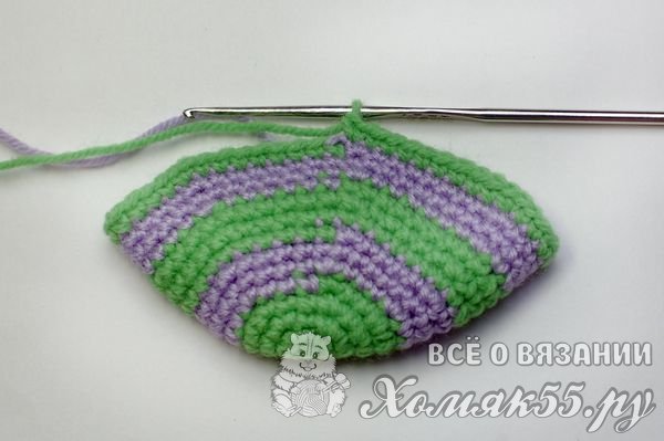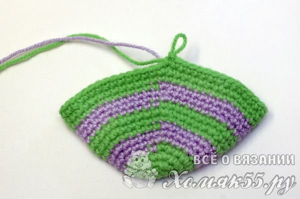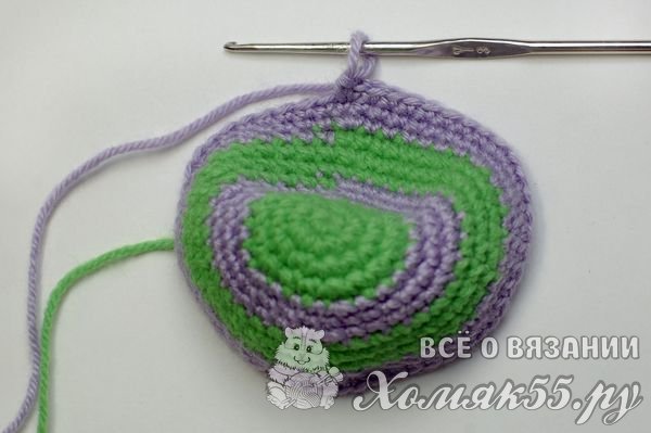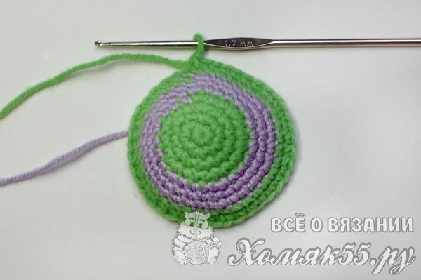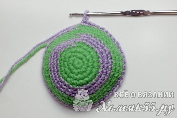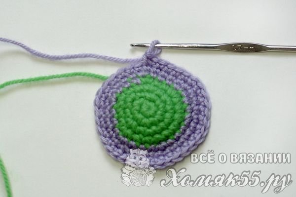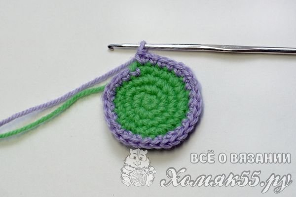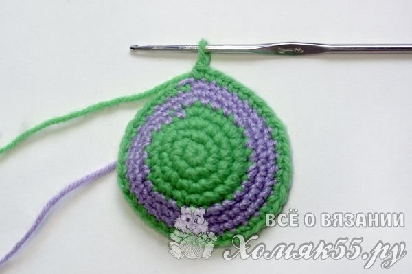 5 ряд. 24 + 6 = 30 СБН. Здесь мы поменяем цвет, причём, зелёную нитку не отрезаем а продолжим вязание сиреневой. Делаем прибавки во все четвёртые, по счёту, столбики.