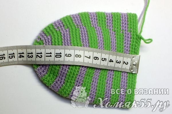17 - 19 ряд. 60 СБН. Сиреневым цветом. С этого момента вязать будем все ряды по 60 СБН, меняя только цвет через три ряда, но прежде надо измерить окружность стопы и окружность носка следочка. Если они соответствуют друг другу, то продолжим вязать этим количеством петель, если надо пошире, то надо добавить столбиков до нужного размера. В нашем варианте 22 см.