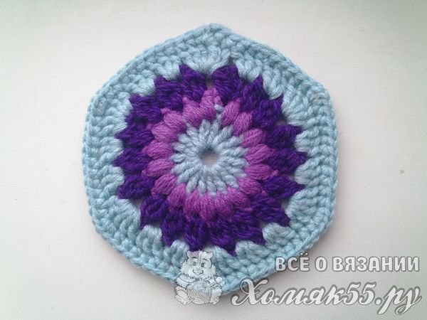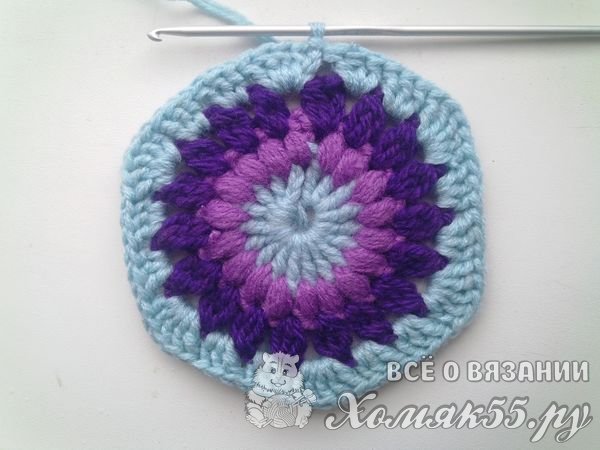 Теперь опять будем вязать голубой пряжей. Вяжем только в промежутках между элементами. Вяжем три СCН. В следующий промежуток тоже три СCН. А в третий промежуток пять СCН. И так по кругу.