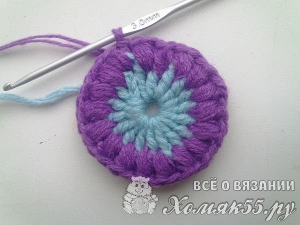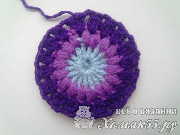 Дальше возьмем сиреневую пряжу и между каждыми столбиками мы будем вязать пышные столбики. Начинаем с двух ВП. На крючок делаем накид и вводим крючок в ту же точку. Вытаскиваем рабочую нитку и, не провязывая вообще ничего, повторяем еще раз. Теперь все петельки с крючка провяжем одновременно одной петлей. И сделаем одну ВП. Из следующих петель мы вытягиваем рабочую нитку три раза и только тогда провязываем. Так вяжем весь круг.