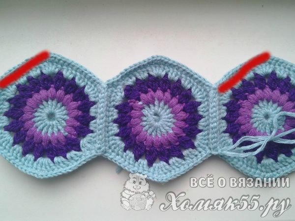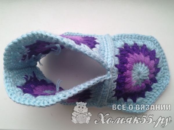 Теперь мы мотивы сшиваем. Сшиваем как бы полоской. И далее нам нужно сшить стороны, которые отмечены на фото ниже. Так мы сформируем верх тапочка. Сшивать можно иголкой, а можно и крючком.
