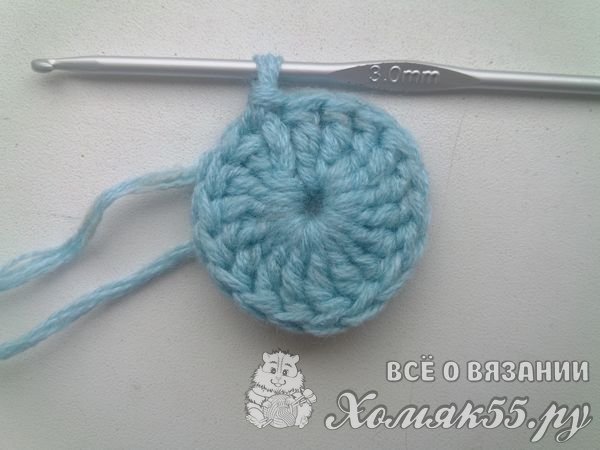 Итак, приступим к началу вязания и сделаем скользящую петельку. В нее мы провяжем 18 СCН. И делать это будем голубой пряжей.