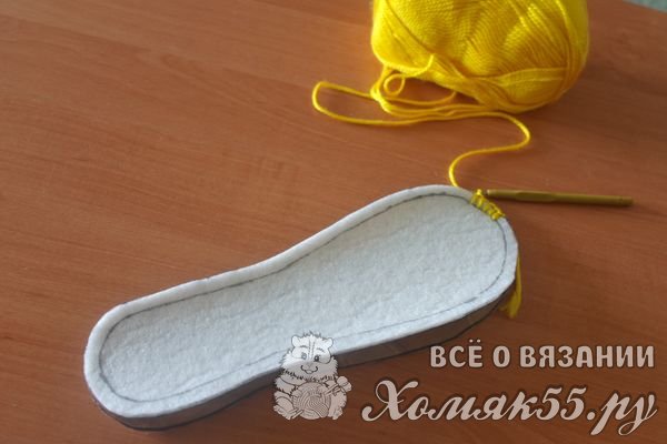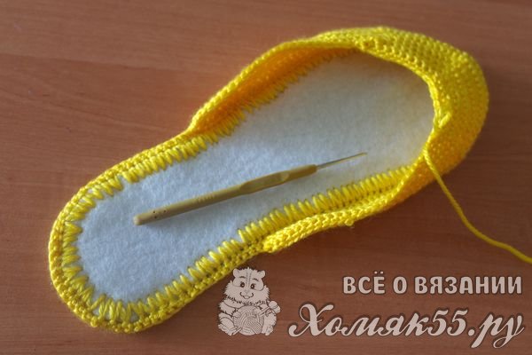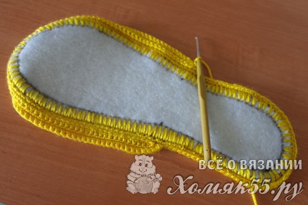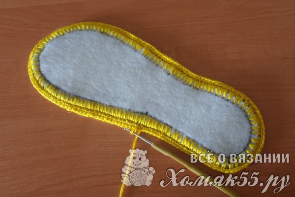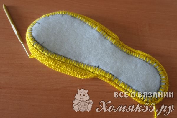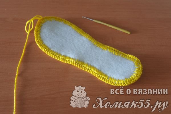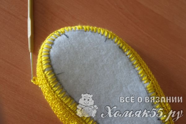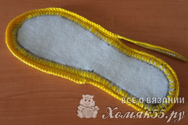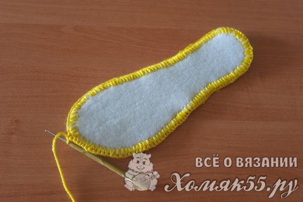 Шилом прокалываем отверстия по контуру линии через 5 мм друг от друга и обвязываем по контуру подошву полустолбиками. Так мы соединим обе части подошвы.