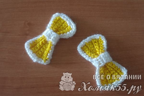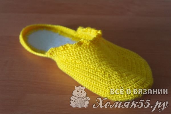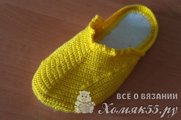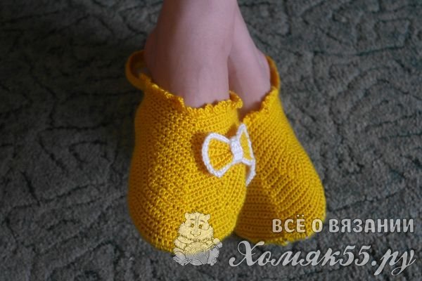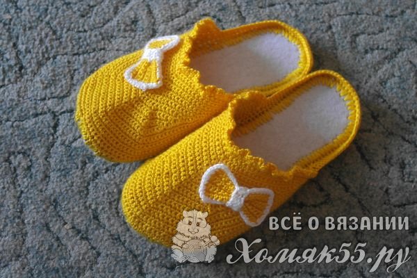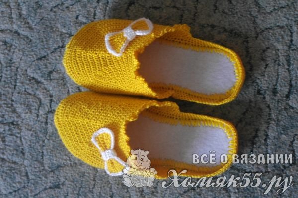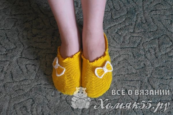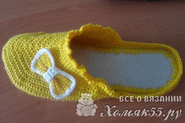Но можно связать любые украшения и пришить их к верхушке тапочек. Можно связать цветы, лепестки, просто цветные круги разных диаметров и цветов, можно нашить пуговицы и многое другое. Я связала 2 желтых прямоугольника (из 15 воздушных петель каждый), затем обвязала их белой пряжей и сделала бантики.