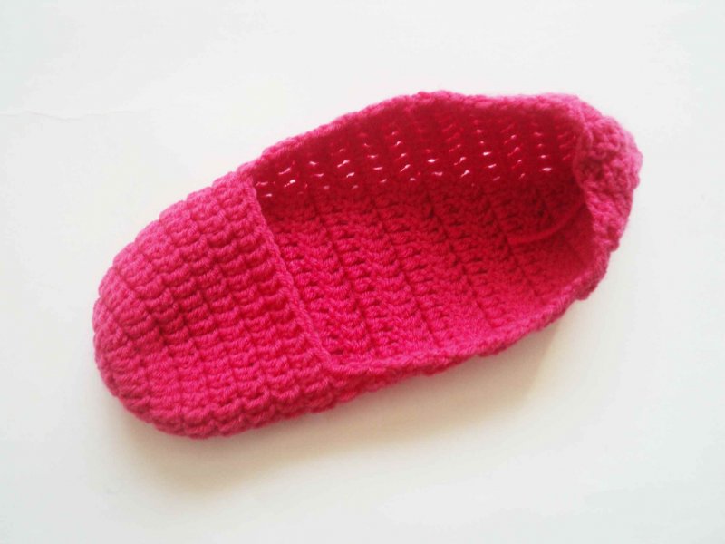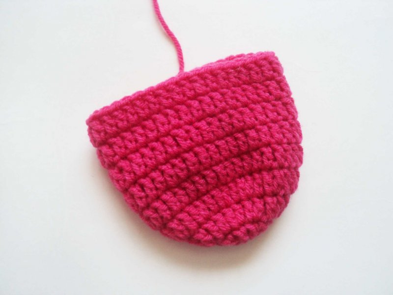Теперь нить фиксируем и обрезаем. Складываем получившуюся деталь так, чтобы хвостик от нитки был ровно по центру. Отсчитываем в обе стороны по 12 петель и ставим метки. Размещаем деталь так, чтобы сторона с ниткой была снизу и прикрепляем петлю в правую метку. Провязываем по 1 столбику с накидом до следующей метки. Получится 24 столбика. Это подошва и боковая часть.