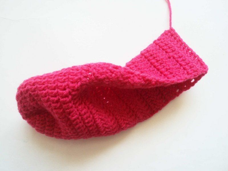 Теперь сформируем пятку. Складываем полотно назад и сшиваем столбиками без накида.