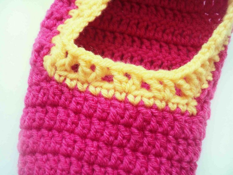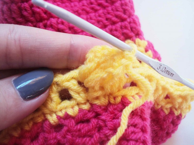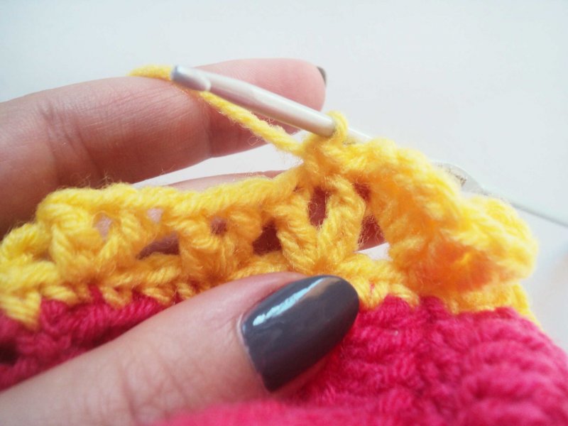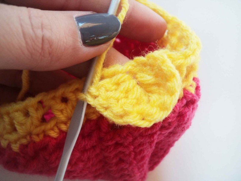 К пяточке прикрепим желтую нить и провяжем по 1 столбику без накида. А в уголках свяжем по 3 петли вместе. То есть по 1 петле перед уголком и сам уголок.