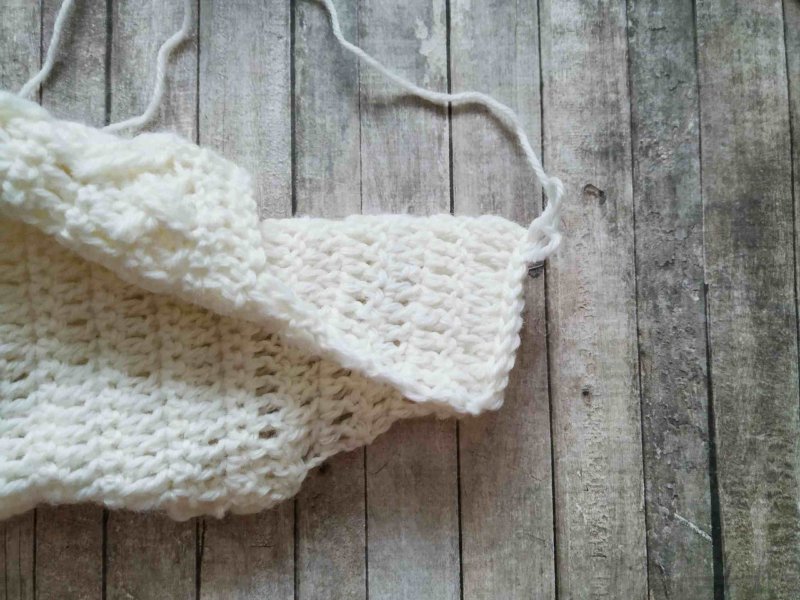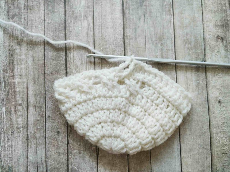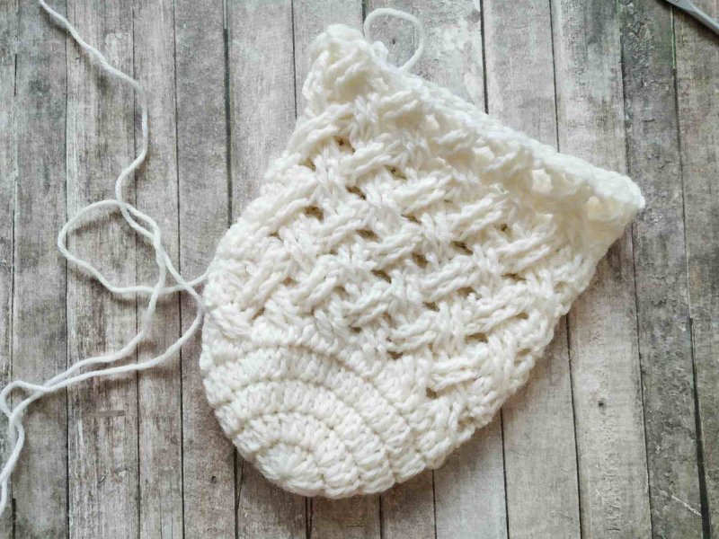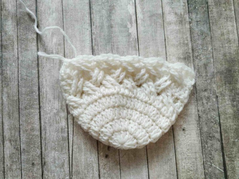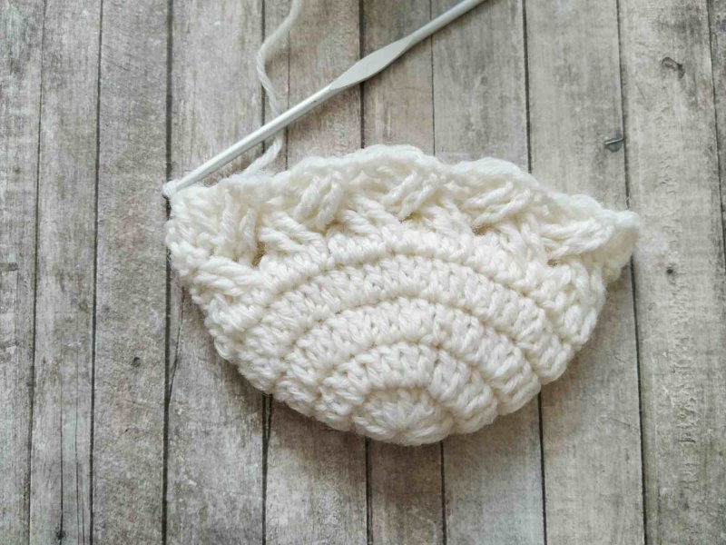 Следующий ряд вяжем просто по 1 ссн, не прибавляем больше. Еще 1 ряд вяжем только половину петель, так как далее будет плетенка.