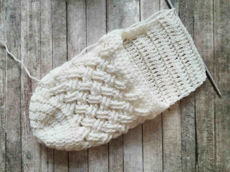 Теперь, провязав последний второй ряд, вяжем ряд из сбн и далее ряд из ссн, но теперь не разворачиваемся. Затем вяжем простые ссн разворотными рядами до нужной длины, чтобы закрылась полностью стопа.
