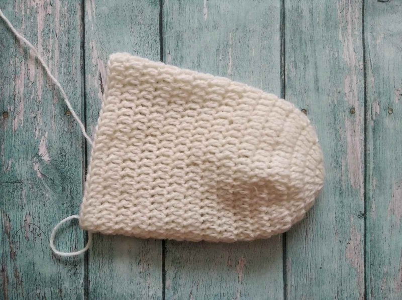 Вяжем в первом ряду прибавки в каждую петельку, в следующем через петлю, далее через две и так далее по принципу круга амигуруми. Вяжем так до необходимого диаметра передней части носка. То есть складываем круг пополам и так мы видим ширину носочка.
