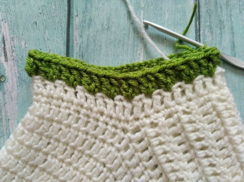 Вяжем 4 С/С/Н с общей вершинкой и делаем 2 В/П. В серединку следующей галочки также провязываем 4 С/С/Н и с общей вершинкой и так далее. А затем провязываем 3 ряда белой пряжей С/С/Н.