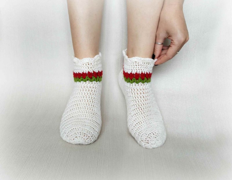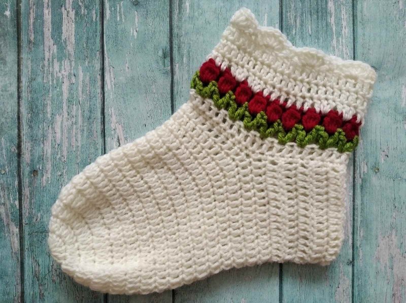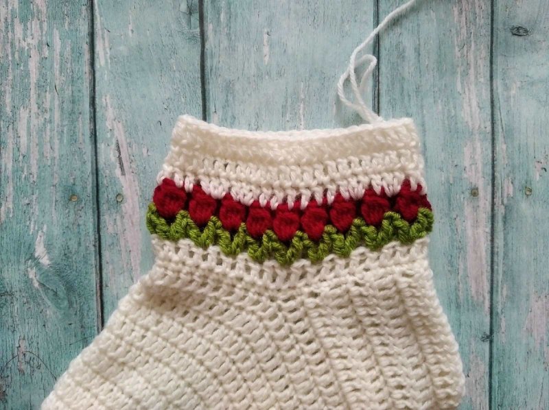 Присоединяем нить зеленого цвета для начала вязания тюльпанчиков на манжете. Вяжем листики. Делаем 3 В/П и плюс еще 1 петелька. Сюда же провязываем 1 С/С/Н. Пропускаем петлю и вяжем 2 С/С/Н, разъединенных 1 В/П. И вновь пропускаем петельку. Вяжем до конца ряда такие галочки. И в конце провязываем 1 С/С.