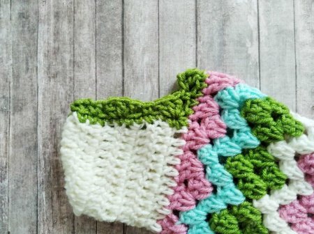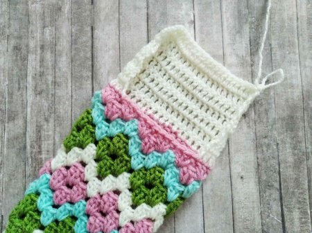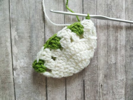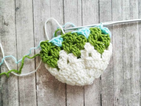 В новом ряду вяжем только зеленой нитью. А затем зеленую чередуем с новым цветом.