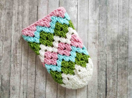 Делаем обвязку ст. без нак. По уголкам с двух сторон вяжем по 3 петли вместе. Обвязываем той нитью, которая должна идти следующей по цвету.