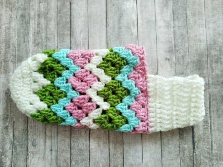 Следовательно, далее ряд этим новым цветом (голубым). Затем голубой чередуем с новым цветом. В данном случае розовым. Далее розовый ряд, а затем розовый чередуем с белым. И так нужно провязывать нужное количество рядом.