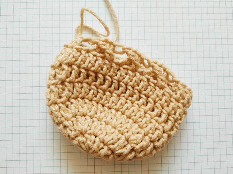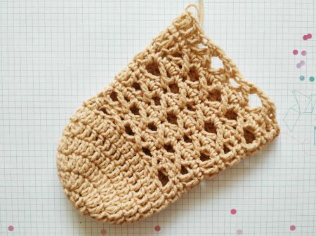Теперь каждый ряд носка будем начинать с 3 петель, а заканчивать 1 соединительным столбиком в 3 из них. Во втором ряду провязываем по 2 стсн в каждый стсн нижнего ряда.