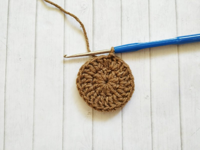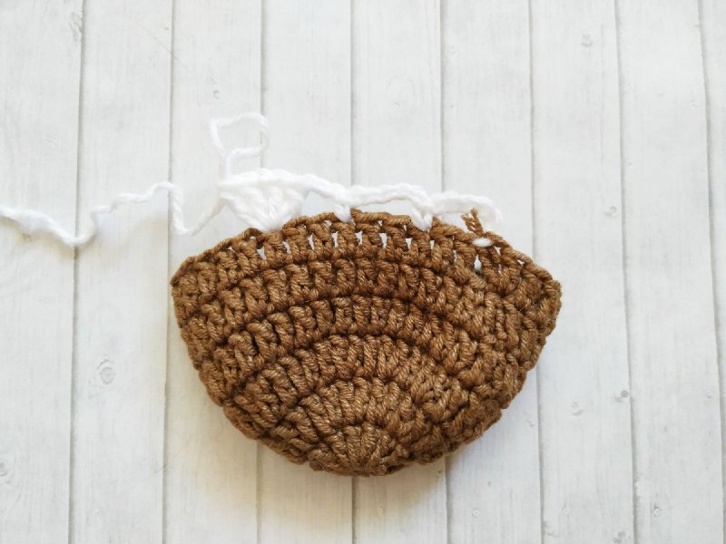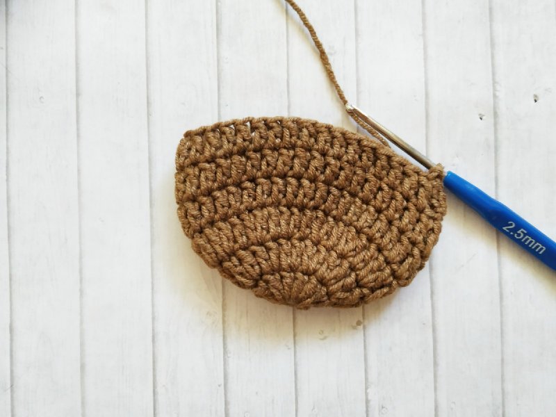 Теперь нужно сформировать пятку, поэтому берем коричневую нить и прикрепляем ее. Для пятки выделим половину ряда и захватим еще по 2-3 петли с обеих сторон.