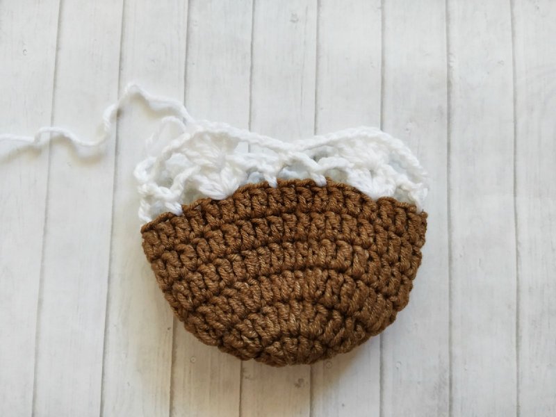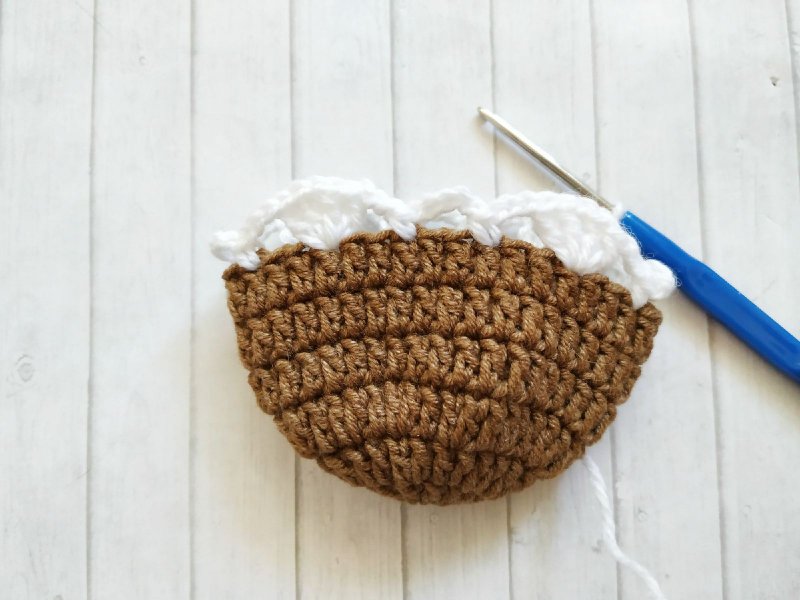 Теперь сменим нить на белую. Вяжем 6 петель (3 для ссн и 3 по узору), затем пропускаем 2 петли и выполняем 1 сбн. Далее 5 петель, пропускаем 2 петли и вяжем снова 1 сбн. Далее 3 петли и 2 ссн через 2 петли основания. Затем 1 петля и еще 2 ссн сюда же.