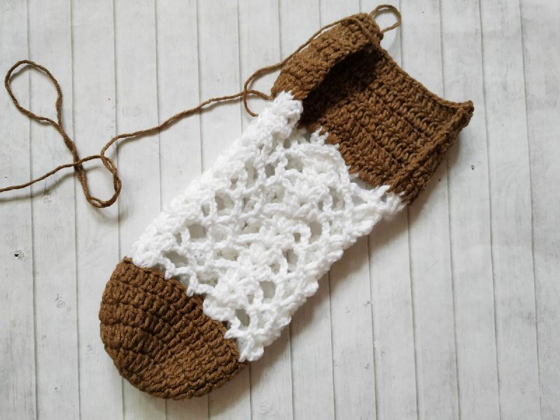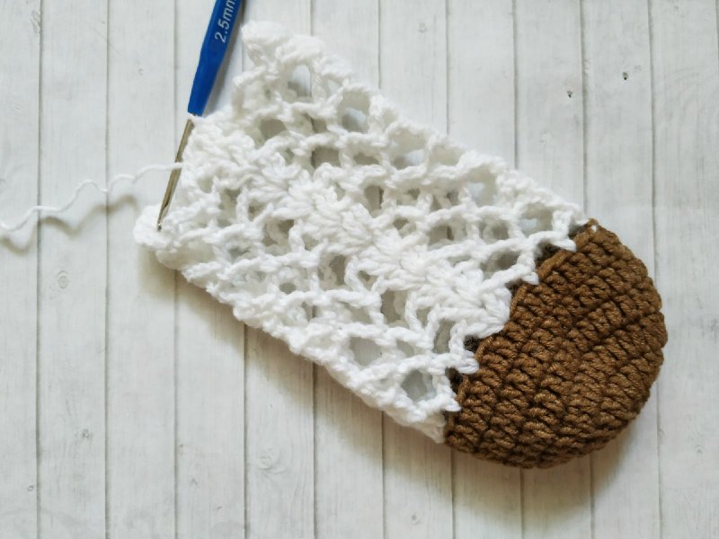 Пятку складываем и сшиваем соединительными столбиками, а потом выворачиваем ее. Дальше вяжем уже по кругу сбн. Провяжем 4 ряда и сменим нить. Свяжем еще 2 ряда белой ниткой.