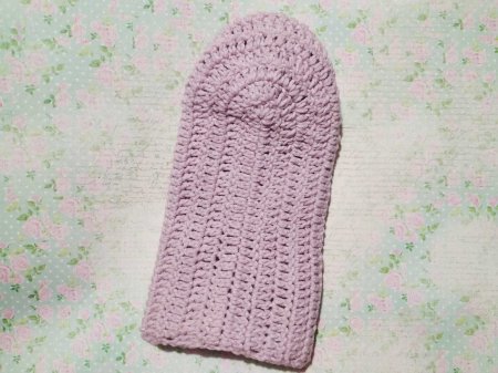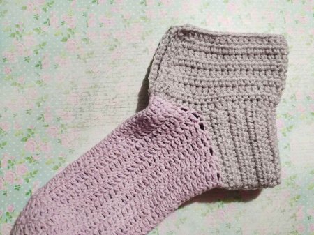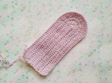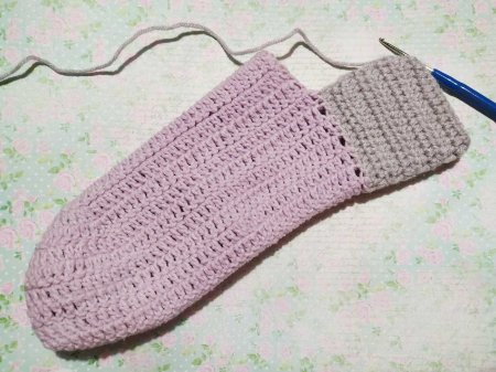 Когда длина заготовки будет выполнена, провязываем ряды без прибавок. Просто выполняем по 1 ссн в каждую петлю. Так вяжем, пока полотно не будет полностью окутывать стопу без пятки.