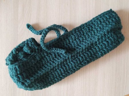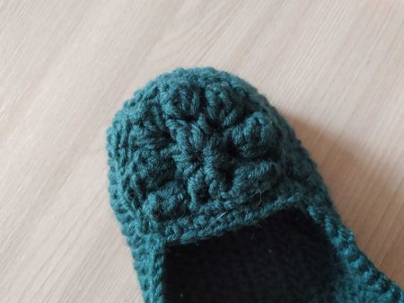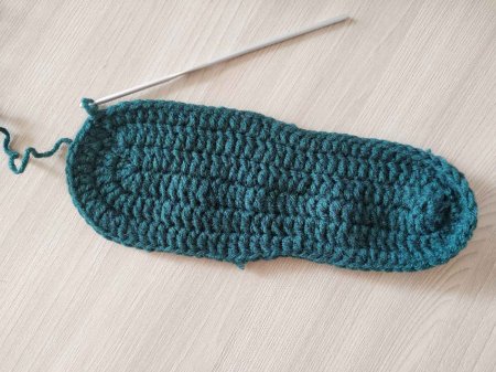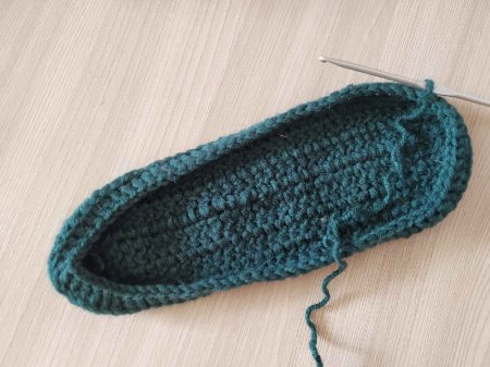 Прежде чем вязать новый ряд отметим по 1 петли по центру каждой стороны детали. Со стороны пятки вяжем полустолб/с/н., а в петли носка вяжем столб/с/н. В каждую петлю по 1 элементу, кроме 12 петель на закруглении с двух сторон. В них вяжем с прибавкой через 1 петлю.