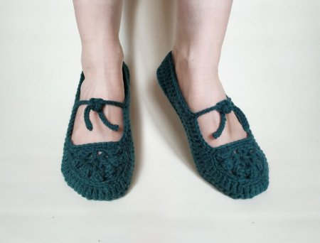 Прикрепляем нить сзади в пятку по центру. Вяжем до середины столб/б/н. Затем провязываем 20 воздушных петель. Провязываем по 1 соединит. столб. в каждую петлю цепочки. Затем продолжаем вязать столб/б/н., попутно пришивая мотив. Далее довязываем снова до середины столб/б/н. Снова делаем 20 петель и провязываем в них соединит. столб. Заканчиваем ряд столб/б/н.