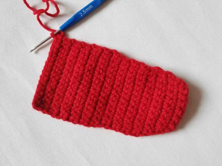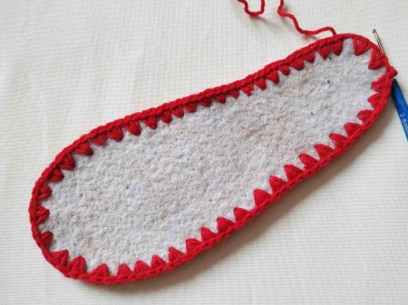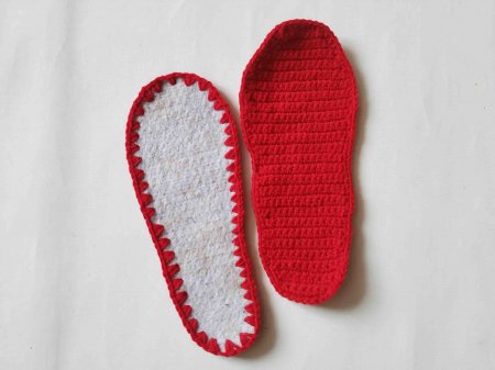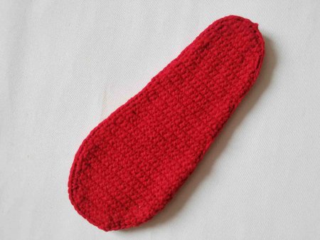 Теперь свяжем внутреннюю часть подошвы. Для этого набираем 8 петель. Затем делаем прибавления по бокам, исходя из ширины подошвы. То есть, нам нужно связать точно такую же деталь. Прибавки делаем, примеряя заготовки. Сначала вяжем прибавление через 1 петлю, а затем смотрим по форме подошвы. Прибавки делаем только в первую и последнюю петли ряда.