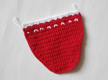 Меняем нить на белую. Вяжем 3 ссн в петлю, пропускаем 2 петли и снова вяжем 3 ссн в петлю. Повторяем так до конца ряда. Нитью такого же цвета вышиваем простые галочки.