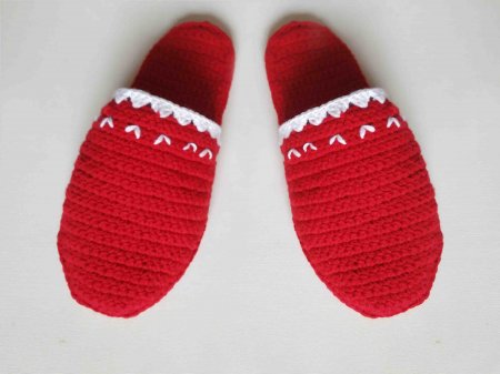 Вяжем верхнюю часть тапочка. Начинать будем с носочной части. Набираем 7 петель. Далее вяжем с прибавлениями по бокам через ряд. Чтобы связать правильную деталь, придется по мере работы примерять тапочек. Это нужно для того, чтобы правильно вывязать необходимую высоту. После этого нужно перестать делать прибавки и просто вязать разворотные ряды до нужной длины детали.