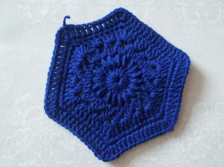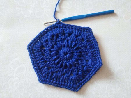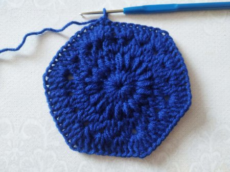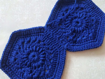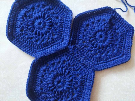 Вяжем 3 одинаковых шестиугольников. Затем будем сшивать. Сначала сшиваем 2 мотива, соединяя по 1 стороне.
