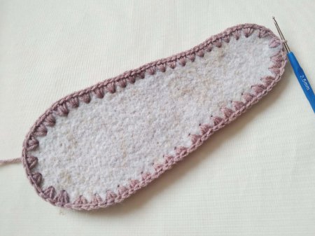 Сшиваем 2 стороны пятки на изнаночной стороне. Теперь снова берем деталь подошвы. Провязываем 2 ряда стбн по кругу.