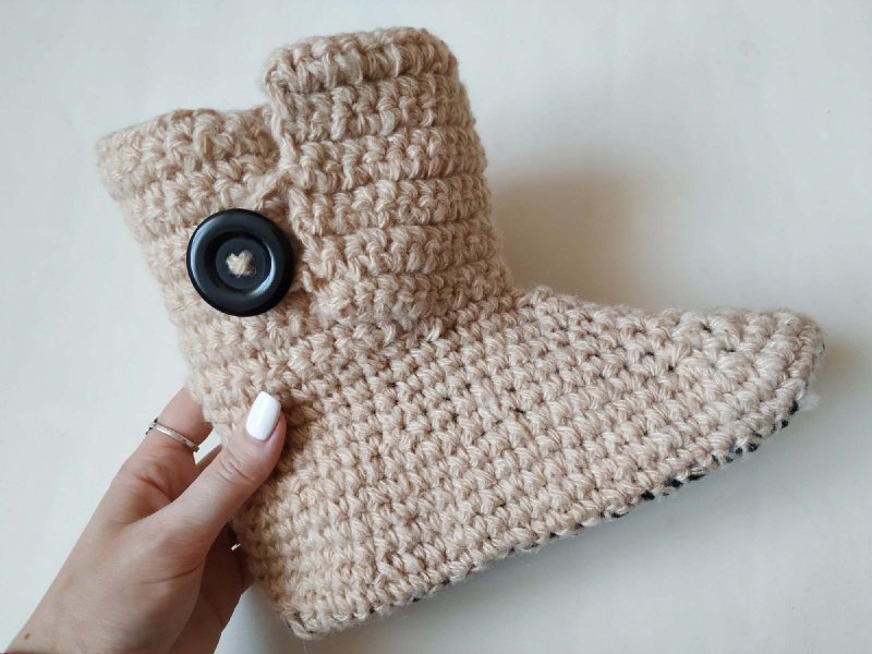 Сшиваем 2 стороны слева сапожка. Осталось только пришить пуговичку на одну сторону и сделать петельку на другую. Петельку делаем из воздушных петель.