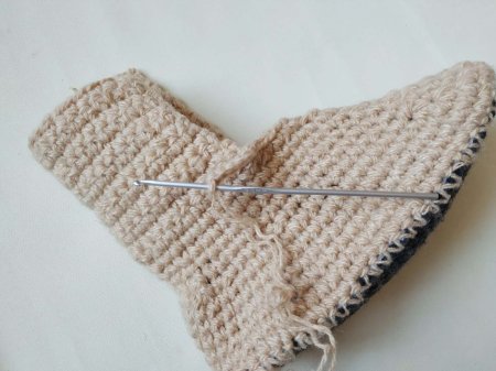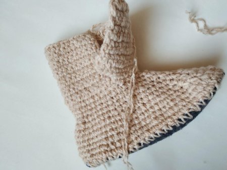 Для правого сапожка прикрепляем нить с левой стороны прямо в следующую петлю после провязанной задней части. Вяжем сбн до конца и добавляем еще 7 петель.