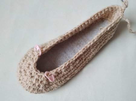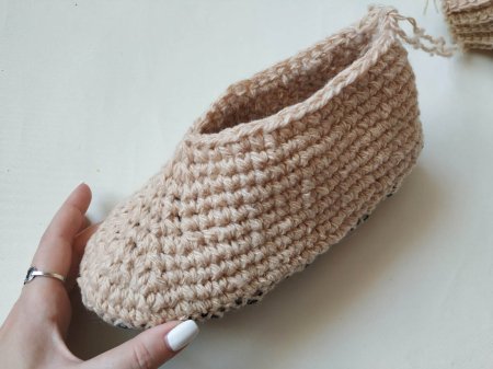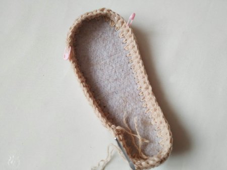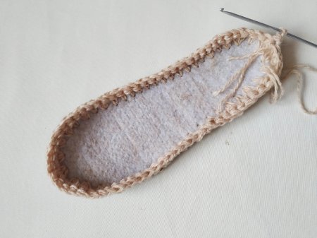 В качестве подошвы используем войлочную стельку. Обвязываем ее столбиками без накида. Провязываем ряд столбиками без накида.
