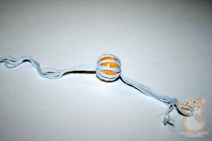 Деревянную бусину обвязываем ниткой, чтобы она стала полосатой.