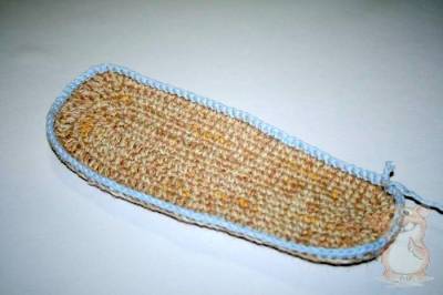 Привязываем пряжу для основы тапочек и, уже без прибавлений для расширения в углах, обвязываем стельку по контуру столбиками без накида.