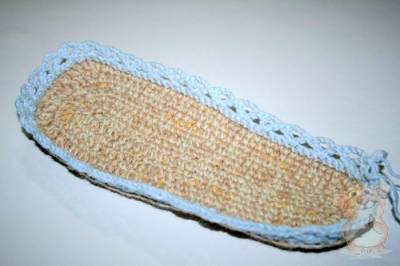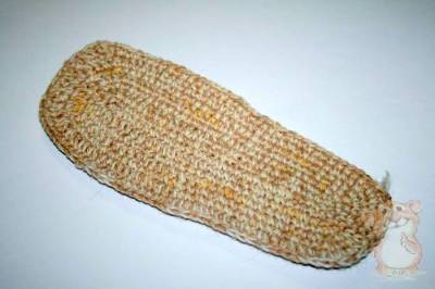 Далее вяжем еще два таких же ряда. Не забываем в каждом ряду в четырех углах в нижние петли вязать по два новых столбика. Последний ряд весь вяжем столбиками без накида. Подошва готова.